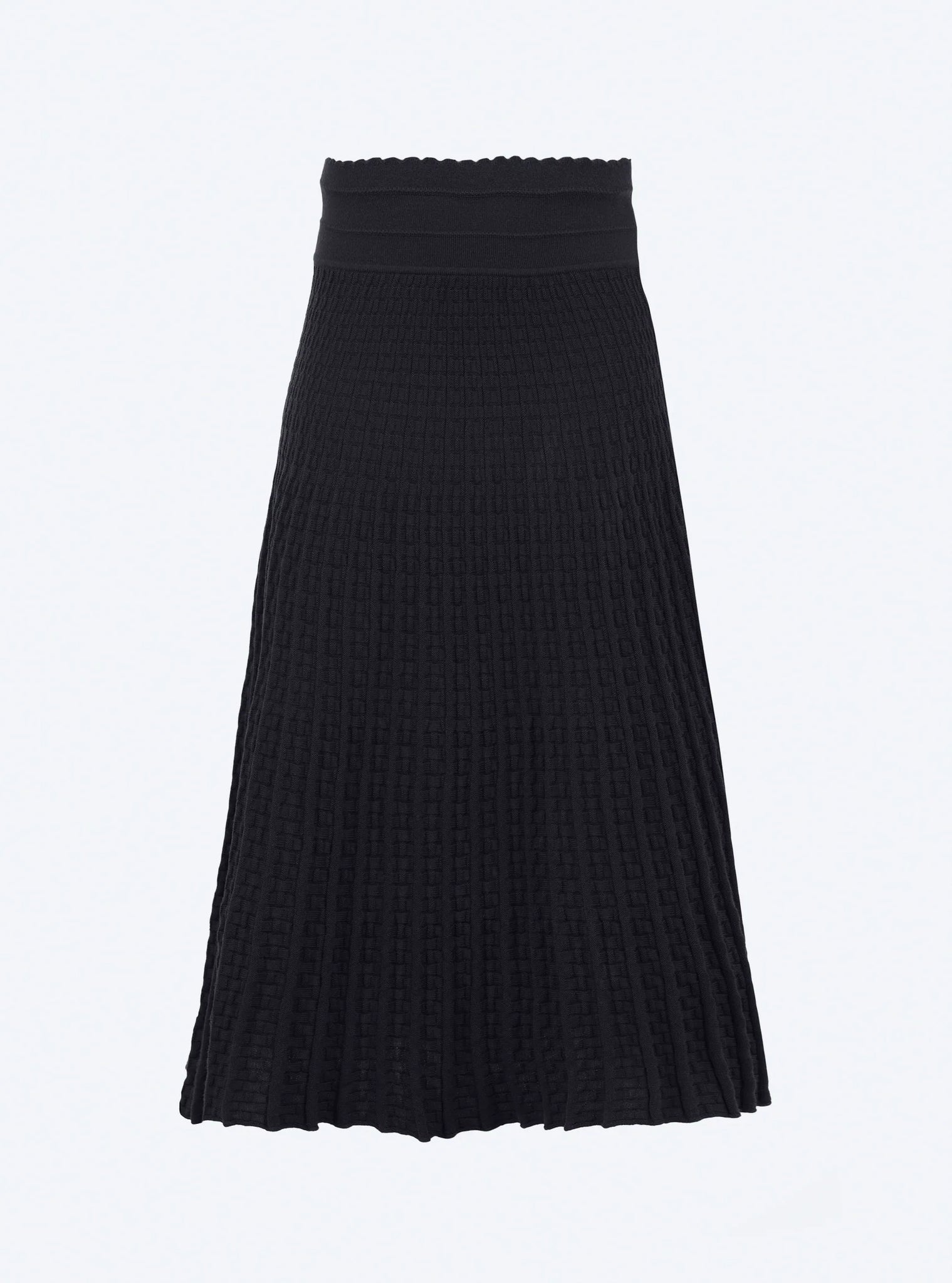 knitted in italy in a pleated arrow knit, this high-waisted mid-length fine knit skirt is light and flowing, sublime in movement. from its high scalloped waistband of great comfort comes a magnificent work of knitting in cane stitch.