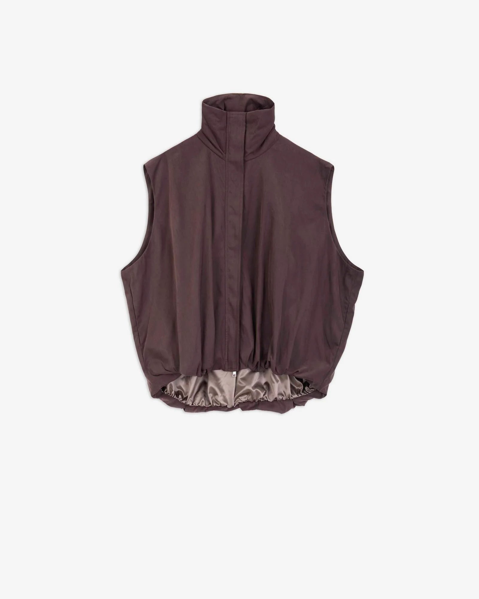 Een mouwloos bomberjack uitgevoerd in een zachte nylon-viscosemix. Het ontwerp heeft een oversized pasvorm en een hoge kraag. De sluiting is subtiel weggewerkt met een metalen rits voorzien van een dubbele slider. De contrasterende voering en de geplooide onderzijde met trekkoord geven het stuk een moderne afwerking. Details Nylon-viscosemix met zachte touch Oversized fit Hoge kraag Verborgen metalen rits met dubbele slider Contrasterende voering Geplooide onderzijde met trekkoord
