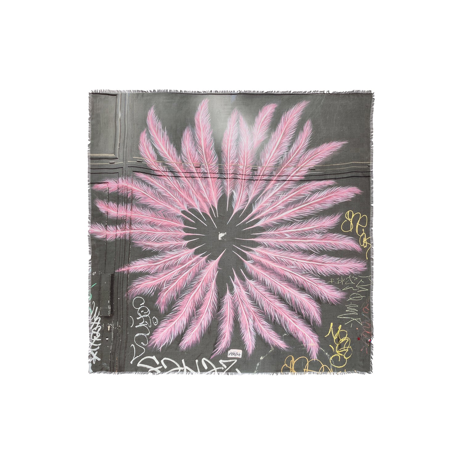 Een gedurfde en expressieve sjaal met een grafisch ontwerp dat doet denken aan straatkunst en performance. Centraal op de sjaal schittert een roze veerachtig patroon dat zich uitspreidt als een dansende waaier, omlijst door subtiele graffiti-details. De donkere achtergrond zorgt voor een krachtig contrast, waardoor het ontwerp nog meer tot leven komt. Deze sjaal is vervaardigd van een luxe mix van modal en zijde en voelt ultrazacht en soepel aan. Dankzij het lichte, ademende materiaal en de speelse franje-afwerking is het een perfecte statement piece voor dagelijks gebruik of speciale gelegenheden. Materiaal:80% modal – 20% zijde Afwerking:Enkele zijde (single face)Rafelige randen Formaat:Royaal en veelzijdig – ideaal als sjaal, omslagdoek of speels accent Wasvoorschrift:Alleen stomenZacht strijken of stomen op lage temperatuur Een artistieke sjaal die kunst, mode en attitude moeiteloos samenbrengt.