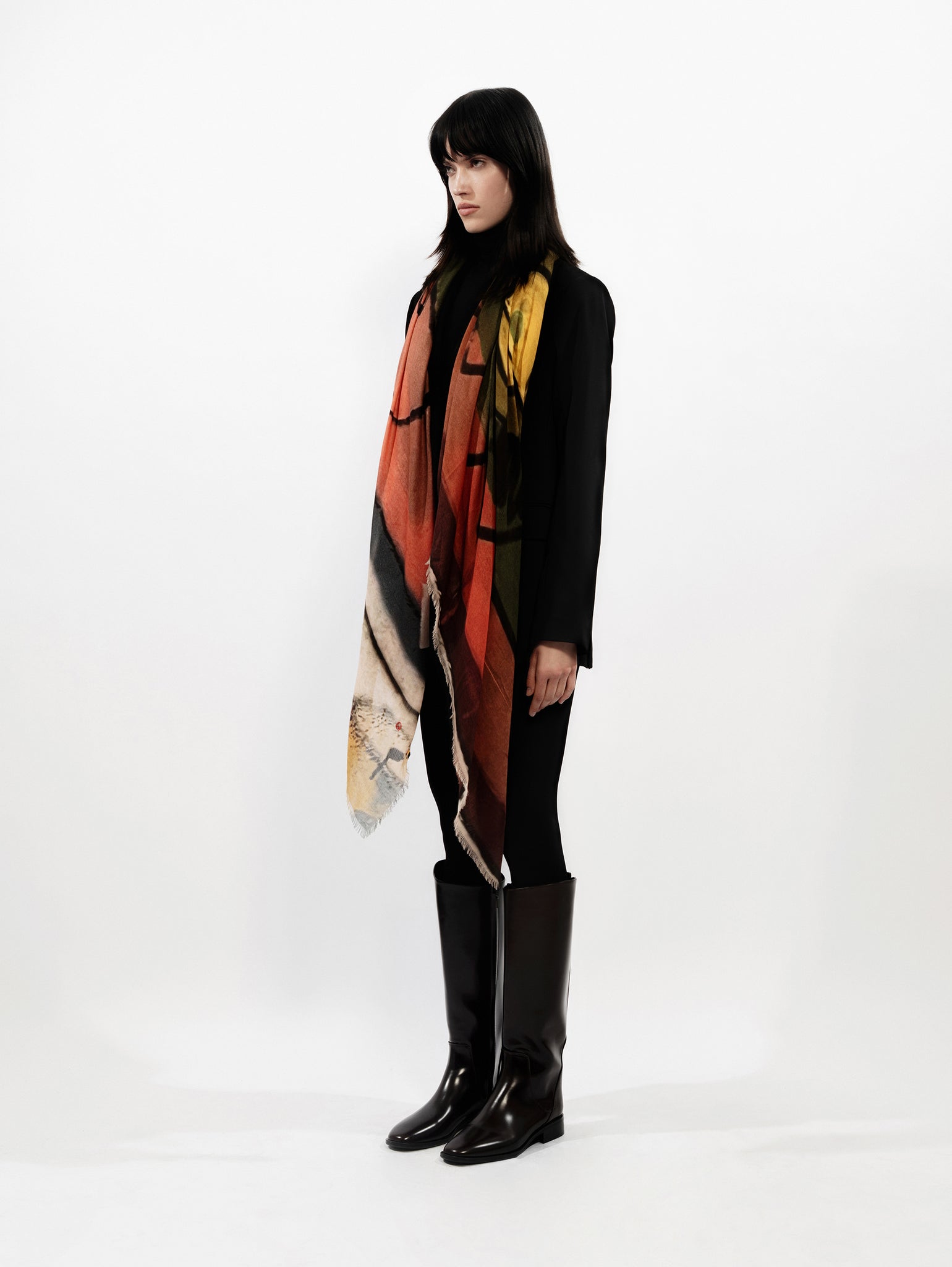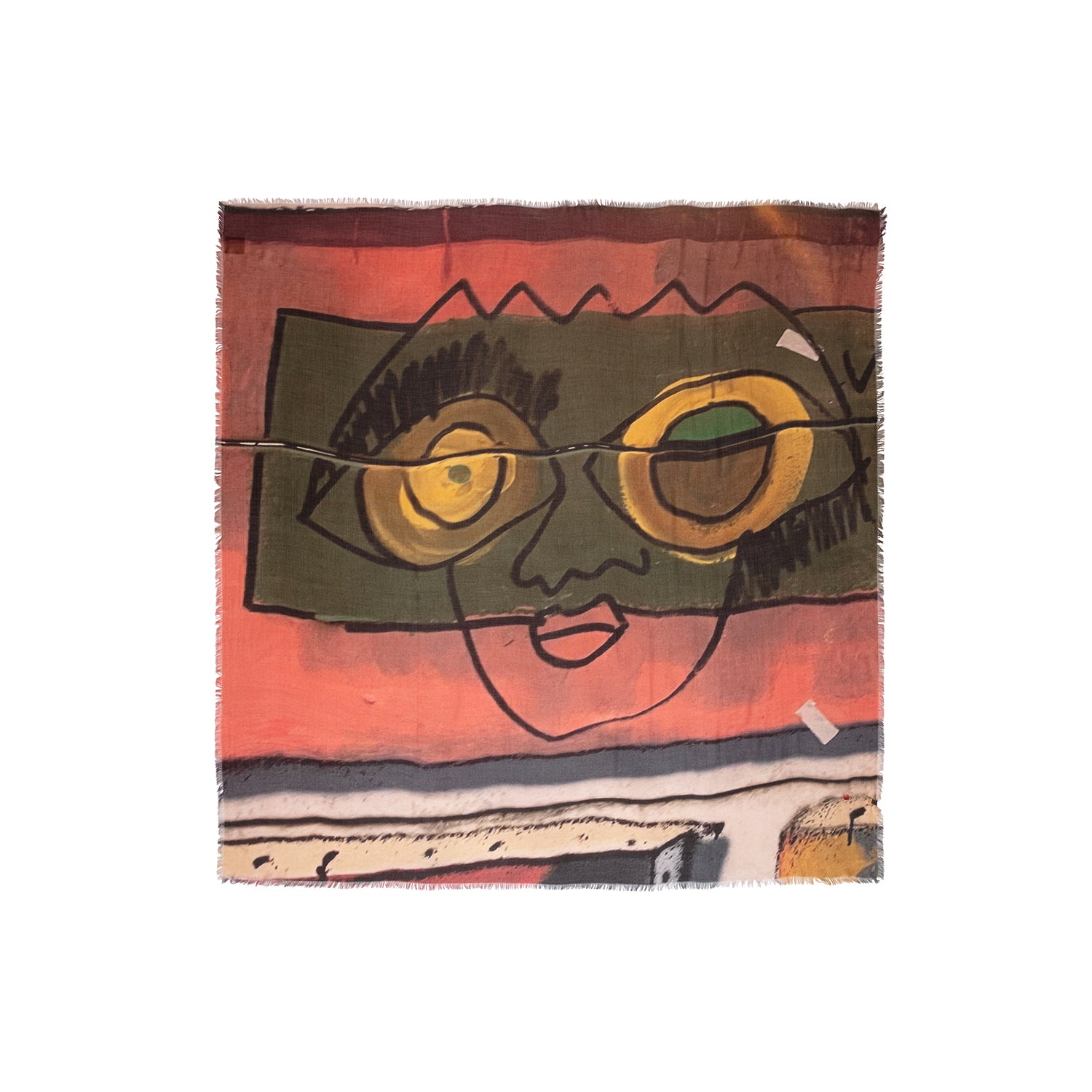 De ‘Ocular’ sjaal van Talking Walls is een opvallend accessoire met een speelse en artistieke uitstraling. Het ontwerp toont een abstracte gezichtsvorm met expressieve ogen in warme tinten zoals rood, oker, olijfgroen en zwart. Deze sjaal voegt karakter toe aan elke outfit, of je hem nu draagt bij een minimalistische look of als finishing touch van een kleurrijke styling. De combinatie van 80% modal en 20% zijde geeft de sjaal een luxueuze zachtheid en lichte glans, terwijl de ademende en soepele structuur zorgt voor een comfortabele draagervaring. De randen zijn onafgewerkt met een subtiele rafel, wat bijdraagt aan de nonchalante charme van het ontwerp. Materiaal: 80% modal, 20% zijdeAfwerking: Enkelzijdig bedrukt, lichte franjerandFormaat: Groot vierkant – geschikt om op verschillende manieren te dragenKleur: Multicolor (rood, oranje, groen, zwart) Een unieke sjaal voor wie houdt van kunst, kleur en verhalen – draagbaar als blikvanger en als persoonlijk statement.