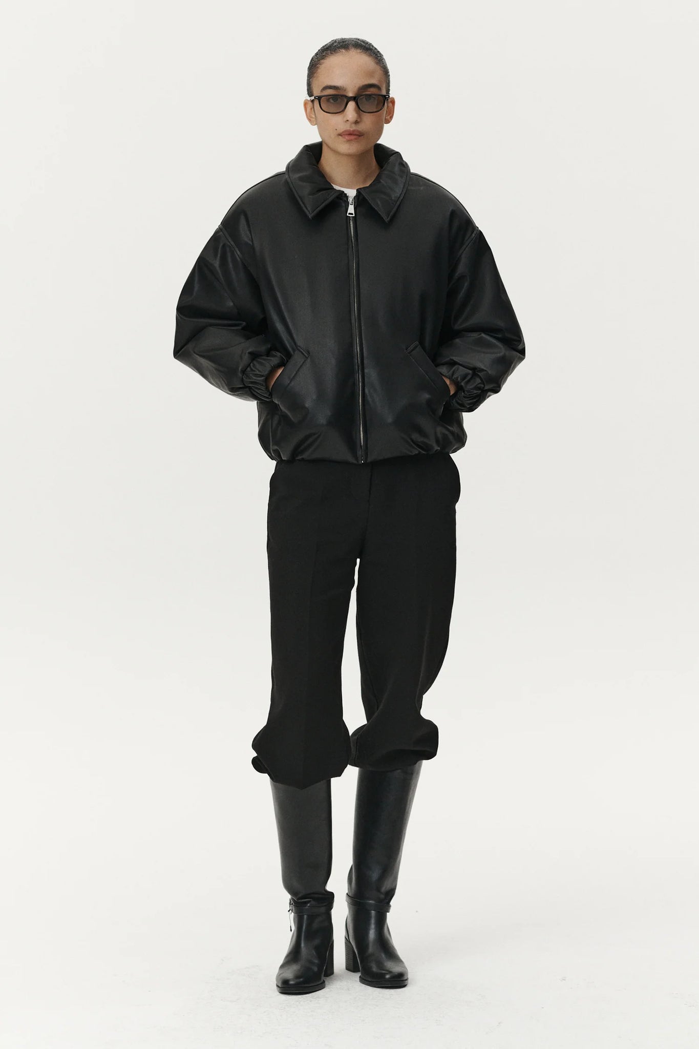 Crafted from high-quality faux leather Magnet front placket closure Recycled polyester insulation of 150 grms YKK zip Flap front pockets with magnet closure Slightly oversized bomber silhouette Model is 178cm and is wearing size Small