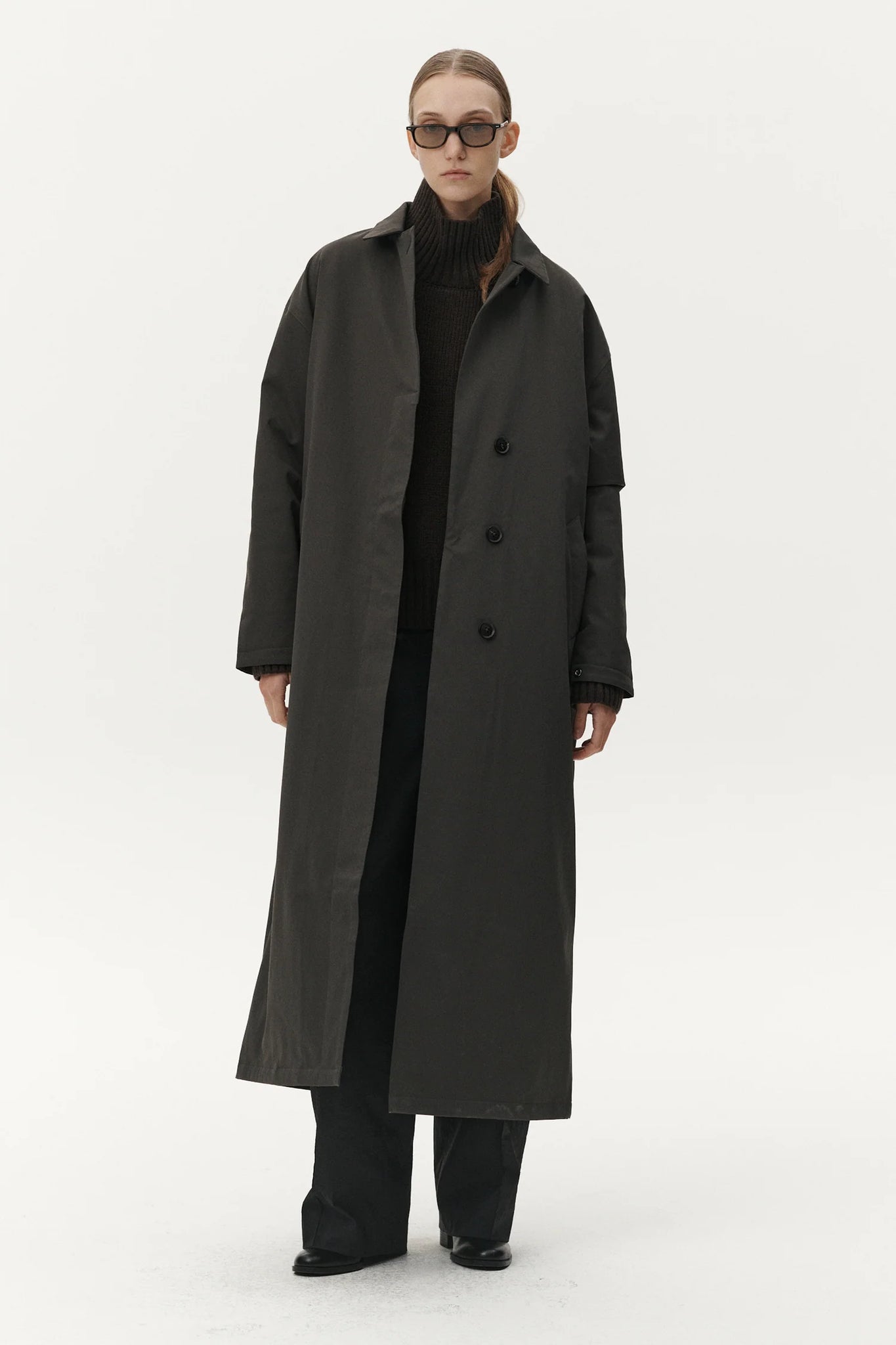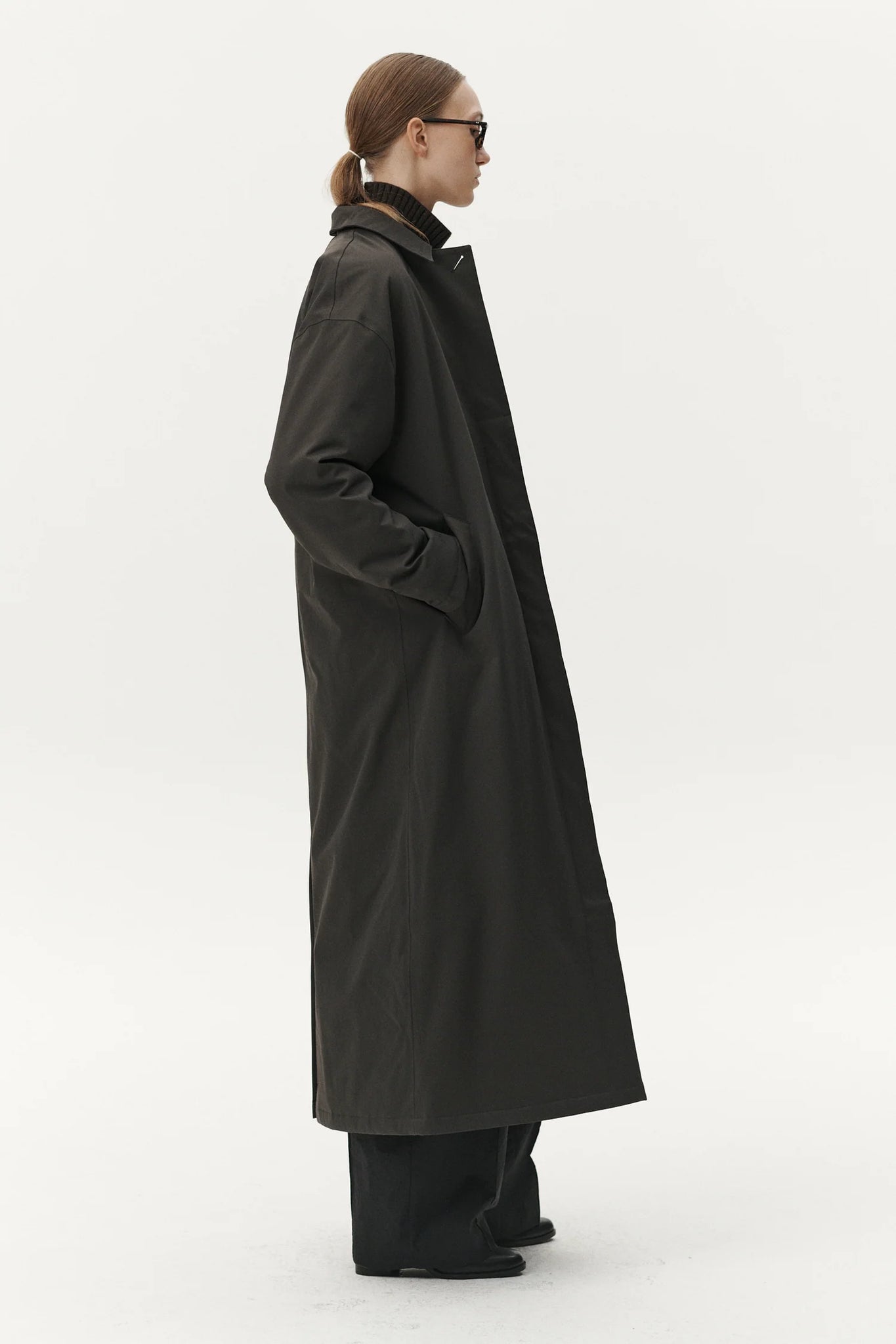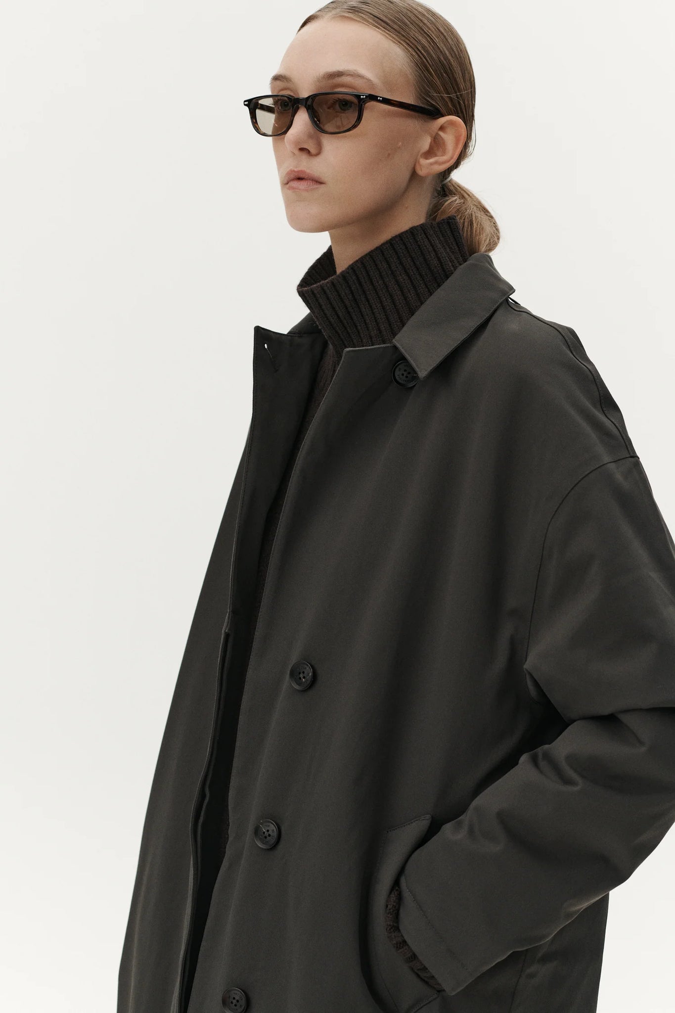 Outer shell - 100% polyester twill 10k water collumn 10k breathability Stand up collar Protects until minus 10 degrees Celsius Insulation with 150 grams Meida Hidden hood Branded horn button closure Sustainable Taped seams PFC free DWR coating Model is 178cm and is wearing size Small